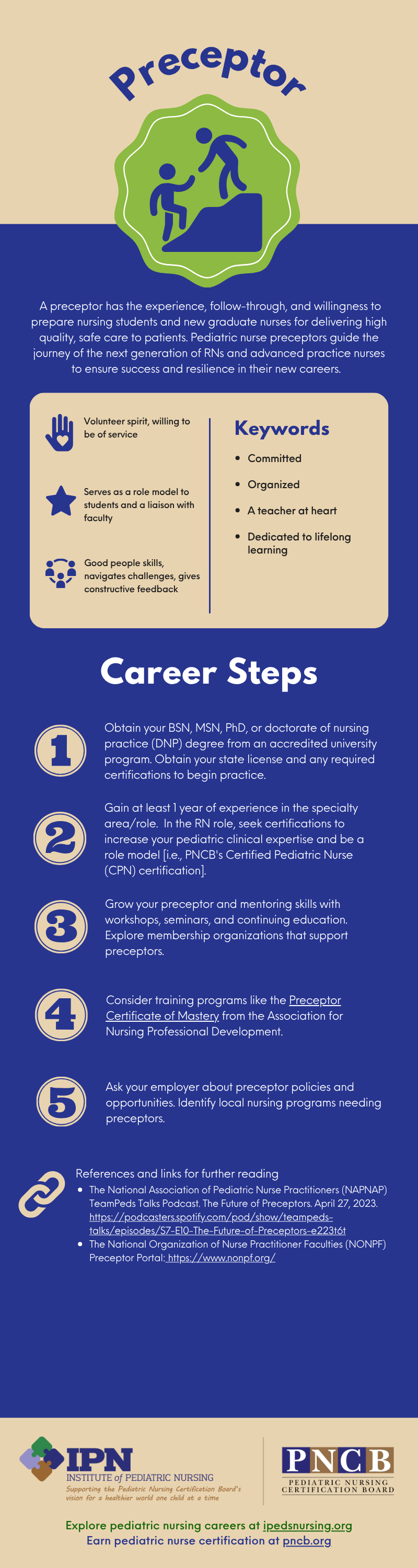Bonus resource: Our parent organization, the Pediatric Nursing Certification Board, offers the continuing education webinar entitled Power Up Your PNP Precepting Skills.