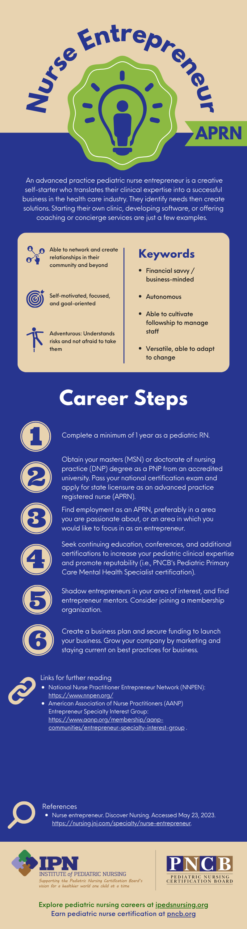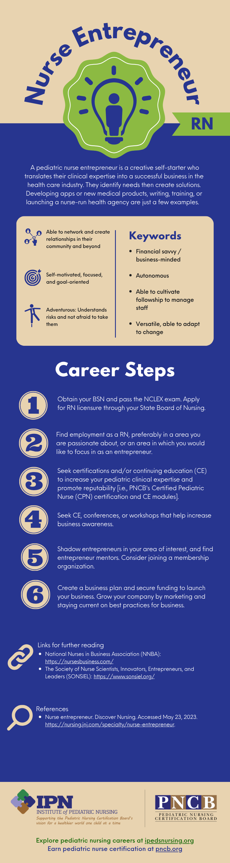 Got big ideas and a mind for business? A pediatric nurse entrepreneur is a creative self-starter who translates their clinical expertise into a successful business in the health care industry. They identify needs then create solutions. Developing apps or new medical products, writing, training, or launching a nurse-run health agency are just a few examples.
